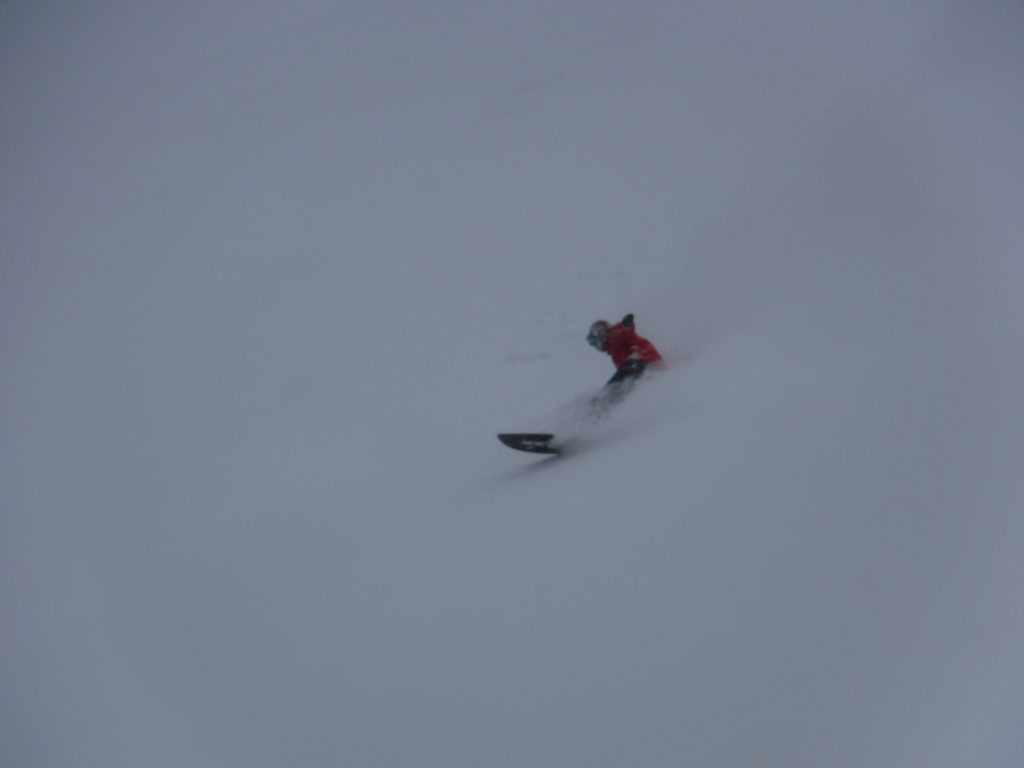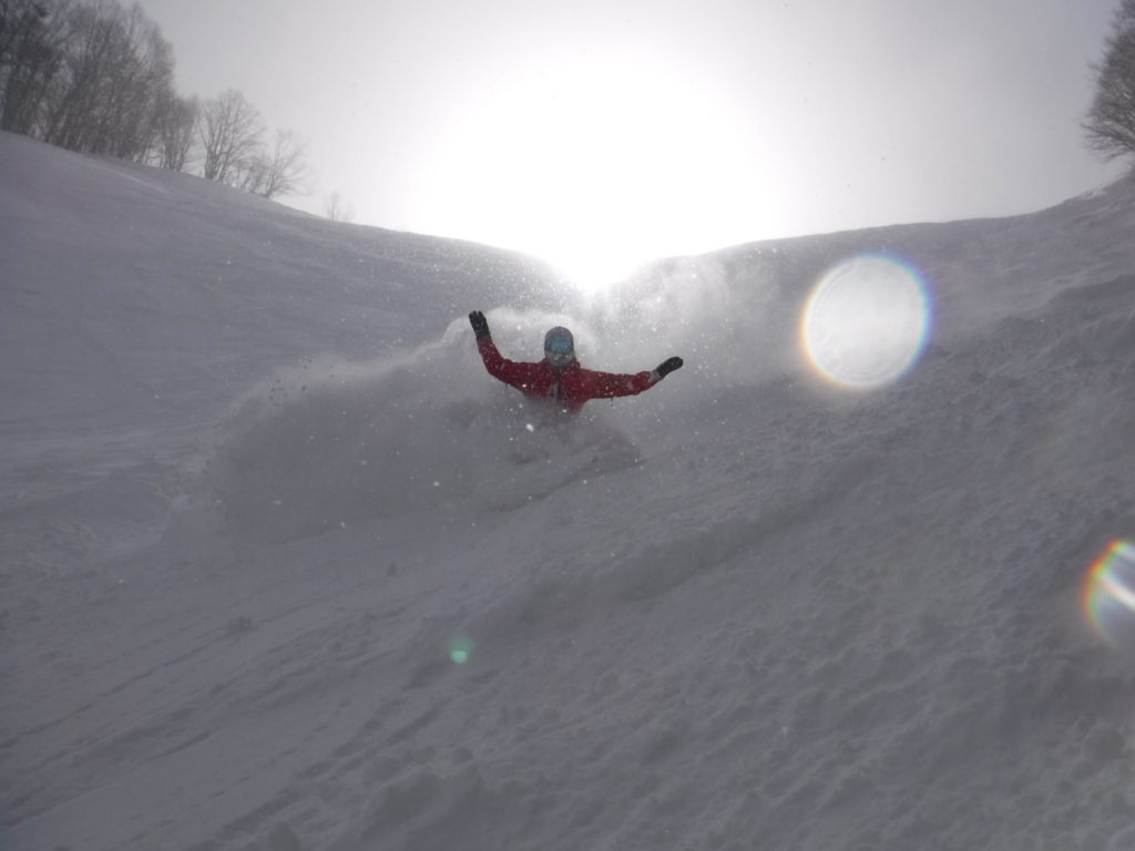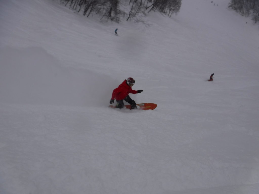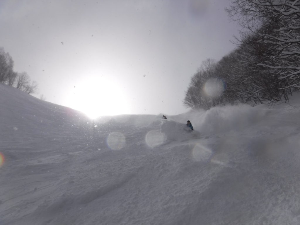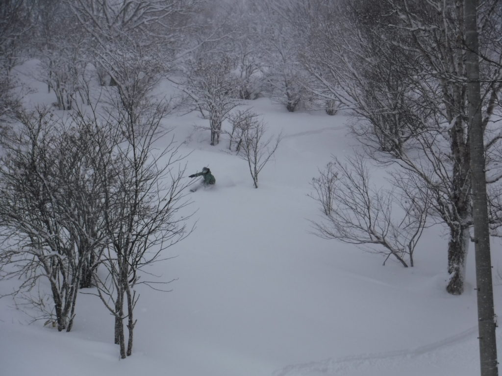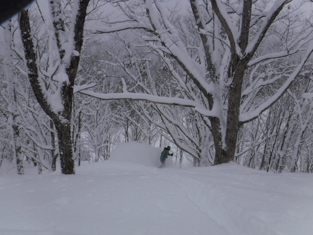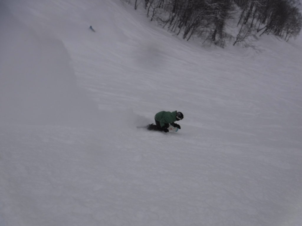 雪が溜まって、殆どノートラックの場所ばかりを狙って滑っての午前ラウンドの締めはこんな感じ。。