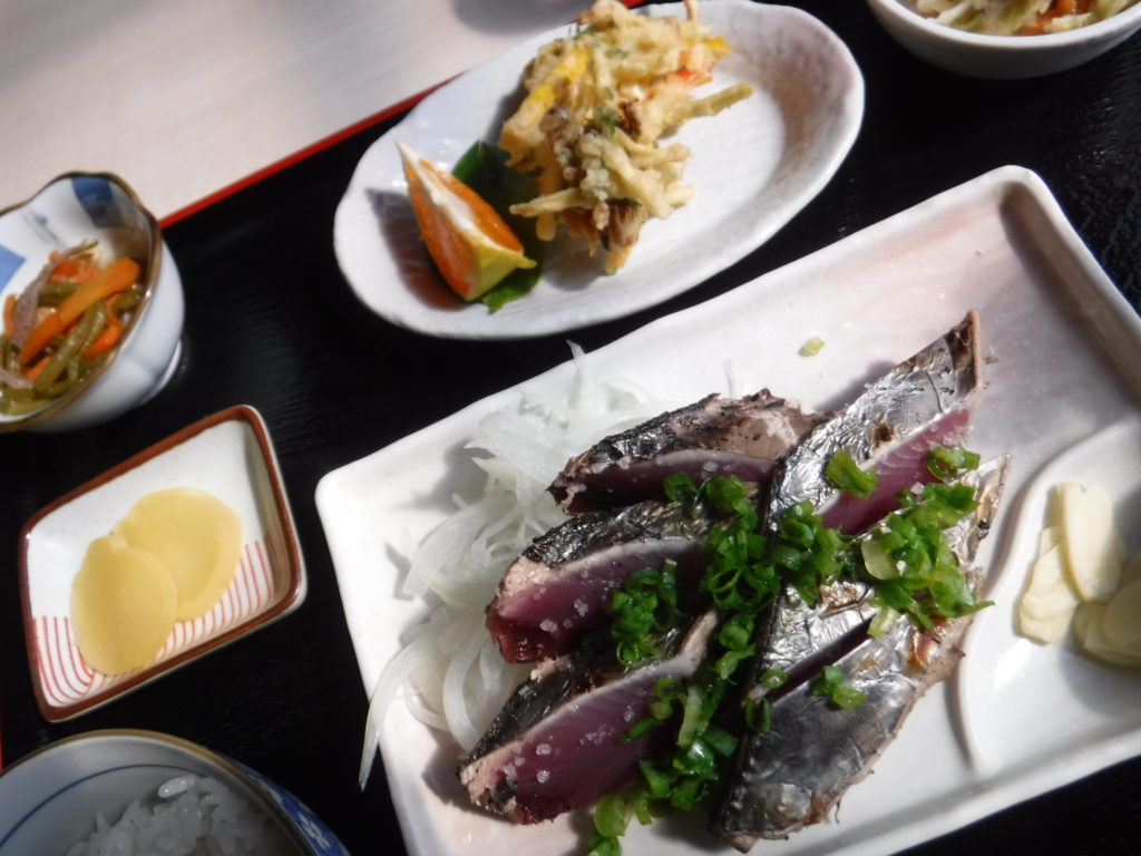 漁港の直ぐ横の食堂で、コレ(カツオの塩たたき!)をペロリ。。