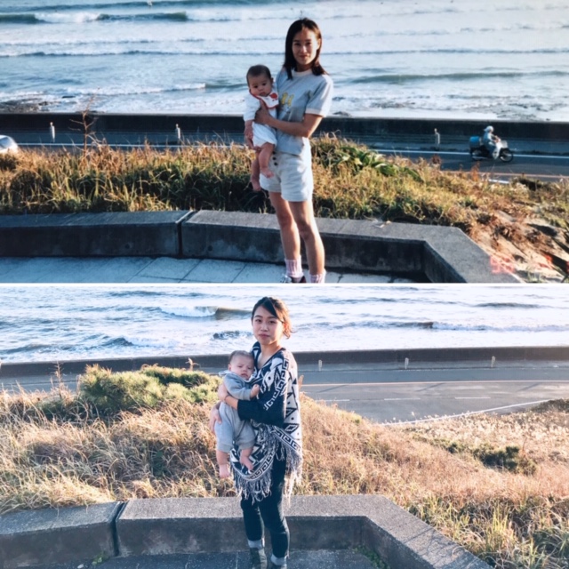 上:23年前⇒和子が産後海復帰の日 / 下:現在⇒光葵が産後海復帰の今日