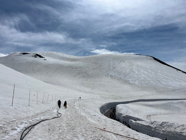 『雪の大谷』の上部を歩いて/一般観光客の皆さんに、滑りもお見せしながらターミナルへ