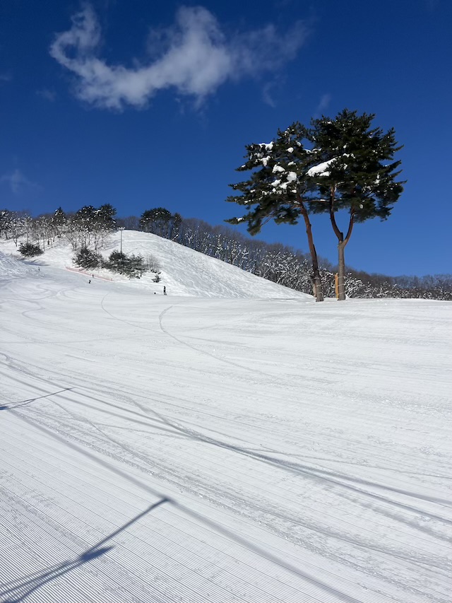 午前Rはやや硬めの圧雪バーンを滑る第一R