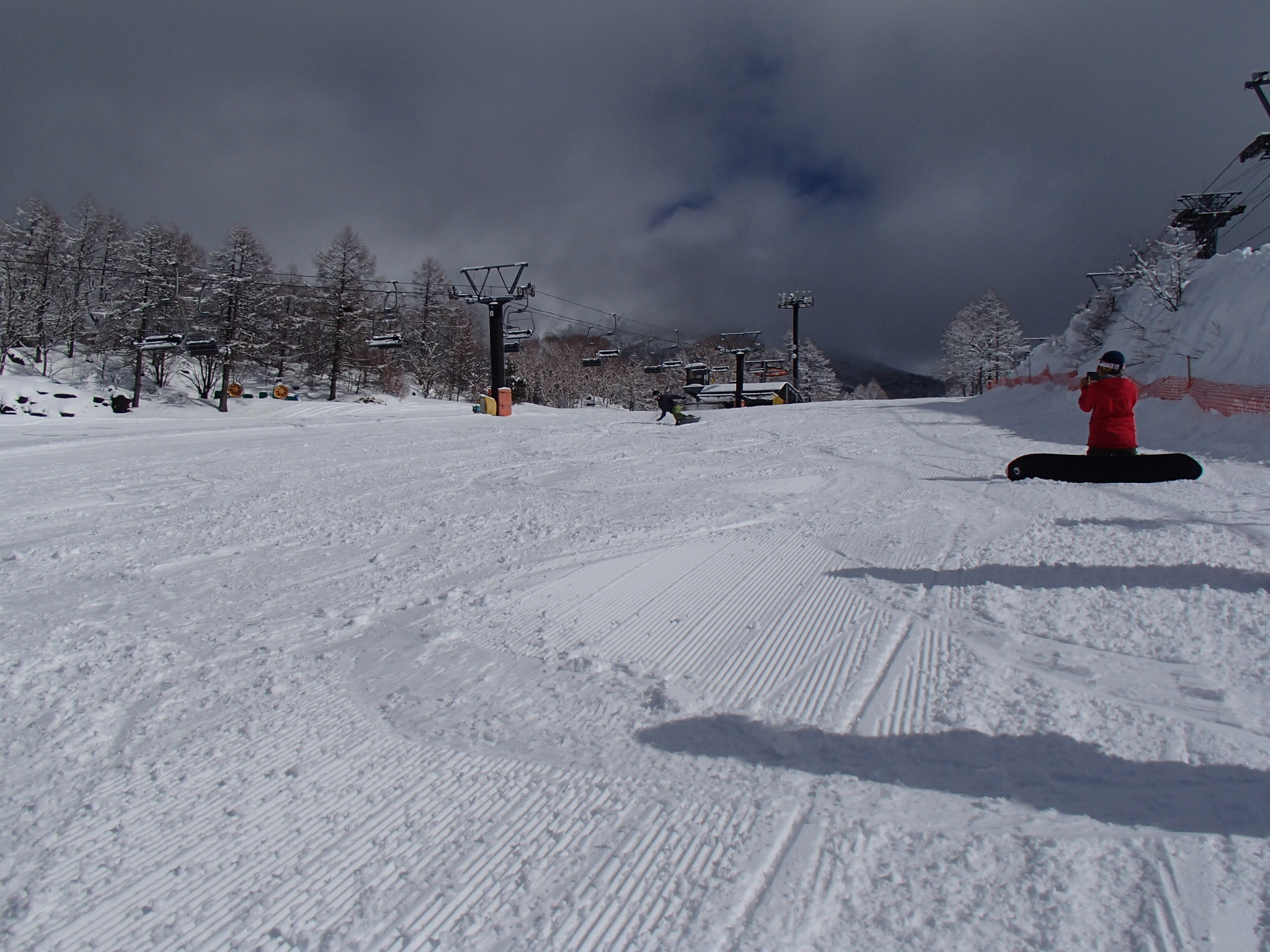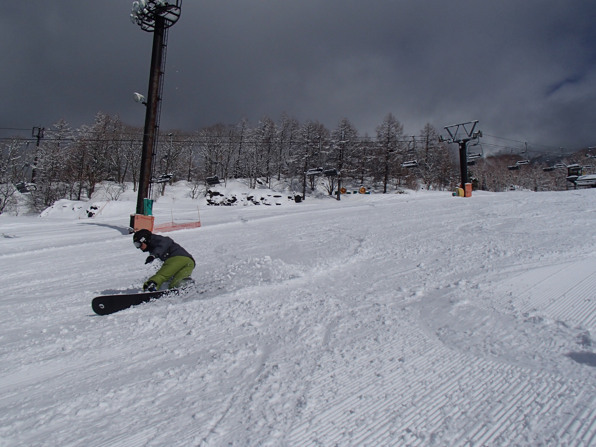 前線通過後の、午後~夕方Rは、ゲレンデ貸切状態で、更に超ラッキー! 滑る度に面ツルの絶好の『SNOWSURF』コンディションを頂きまくり